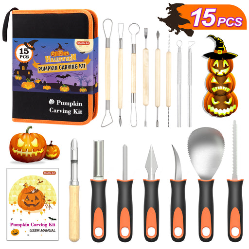 Shuttle ArtCPMPLETE PUMPKIN CARVING KIT: Shuttle Art pumpkin carving kit contains 15 tools, including 1 curved Knife, 1 pumpkin scooper, 1 double-sided toot...