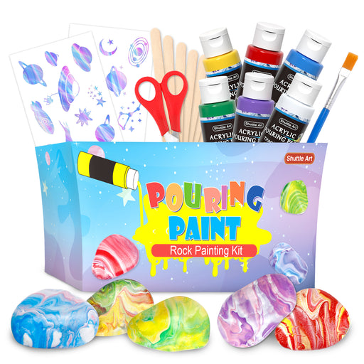 Shuttle ArtCOMPLETE POURING PAINT ROCK PAINTING KIT: Shuttle Art rock painting kit comes with 6 pre-mixed acrylic paints(2oz/60ml), 15 white rocks, paint br...