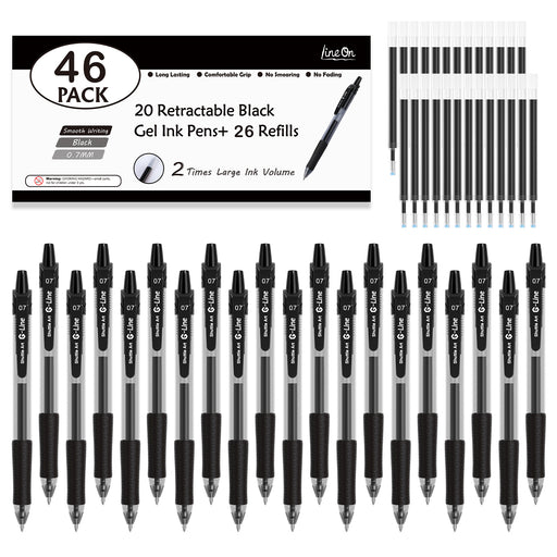 Shuttle ArtQUANTITY: Lineon 46 Pack Retractable Black Gel Ink Pens set has 20 pens with 26 refills, all with black ink. UNLIMITED USES: Lineon 46 pack retrac...