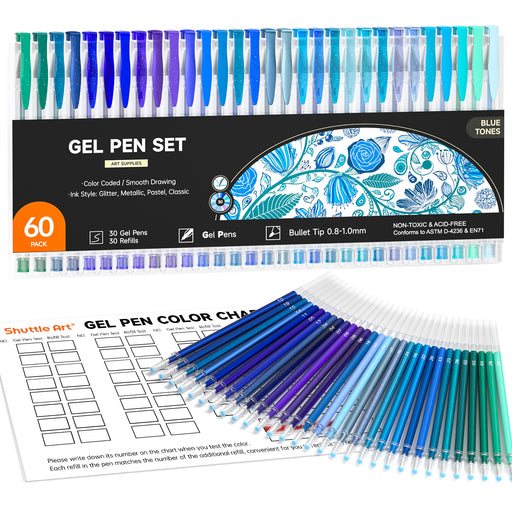 Shuttle Art60 PACK BLUE TONE GEL PENS: Shuttle Art gel pens set has 30 unique blue tone colors with 30 matched refills, including 4 color types: glitter, met...