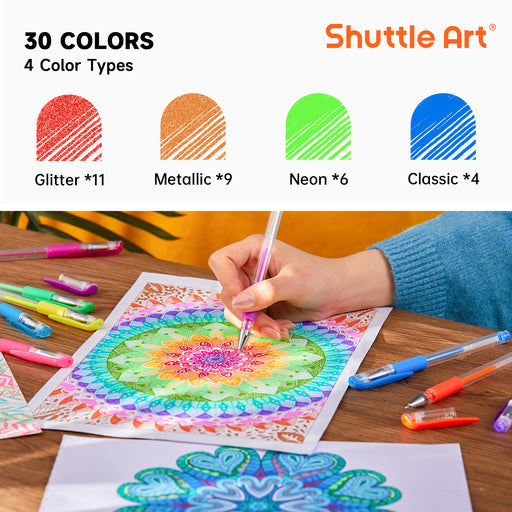 Shuttle Art130 UNIQUE COLORS & 1 BONUS COLORING BOOK: Shuttle Art gel pens set has 130 individual vibrant colors, including 7 types of colors: 31 glitte...