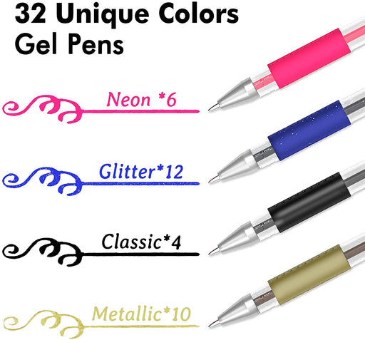Shuttle Art32 ASSORTED COLORS: Shuttle Art gel pens set has 32 individual vibrant colors, including 4 types of colors: 12 glitter, 10 metallic, 6 neon and 4...