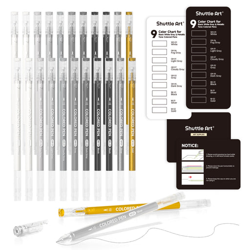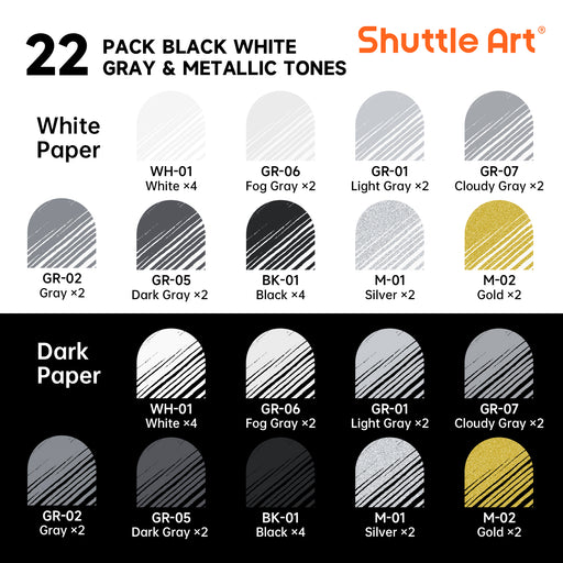 Shuttle Art22 BLACK WHITE GRAY & METALLIC TONES & 2 COLOR SHEETS: Shuttle Art colored pen set comes with 4 Black, 4 White, 2 Silver, 2 Gold and 8 Gra...