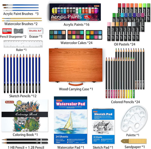 Shuttle ArtALL-IN-ON WOODEN ART SET: Shuttle Art 118 deluxe art set contains sketch pencils, colored pencils, oil pastels, acrylic paints, watercolor cakes, ...
