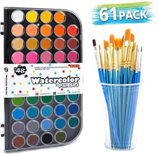 Shuttle ArtShuttle Art 61 Pack Watercolor Paint Set contains 48 assorted solid watercolor paints with 13 FREE paint brushes in the case which are perfect fo...