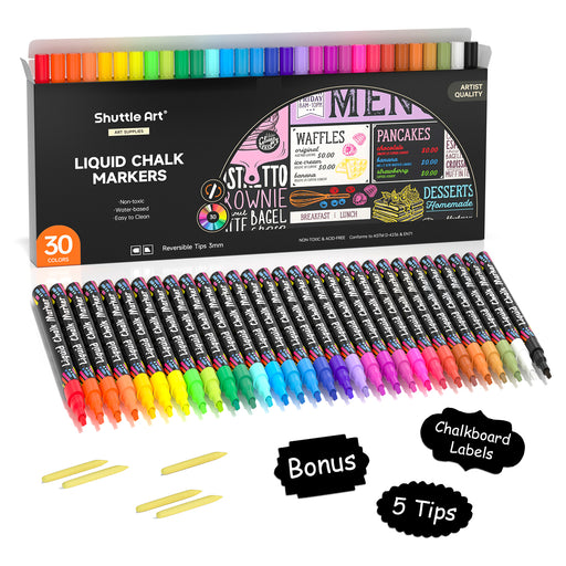 ENDLESS POSSIBILITY: Shuttle Art 30 Vibrant Colors liquid chalk markers + 6 chalkboard labels + 5 tips, reversible 3mm fine tip is perfect for cra...