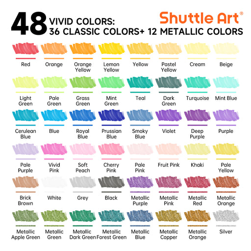Shuttle Art【48 UNIQUE AND VIBRANT COLORS】: Shuttle Art 48 acrylic paint markers set contains 36 vibrant colors and 12 cool metallic colors: metallic gold, m...