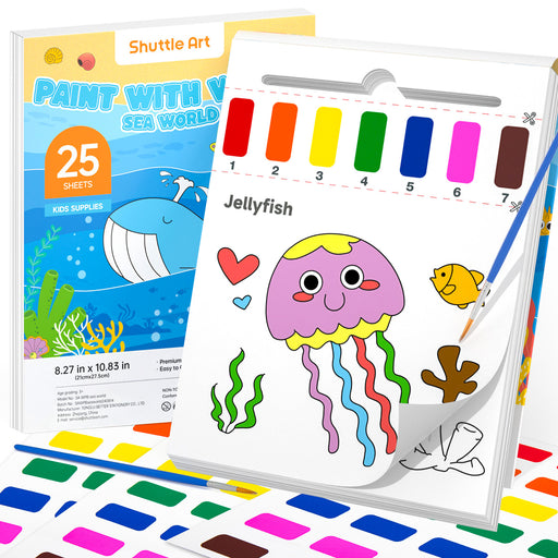 Shuttle Art25 THEMED PAGES: This paint with water coloring book features 25 sea world-themed patterns. It comes with 2 paint brushes and an extra 5 pre-paint...